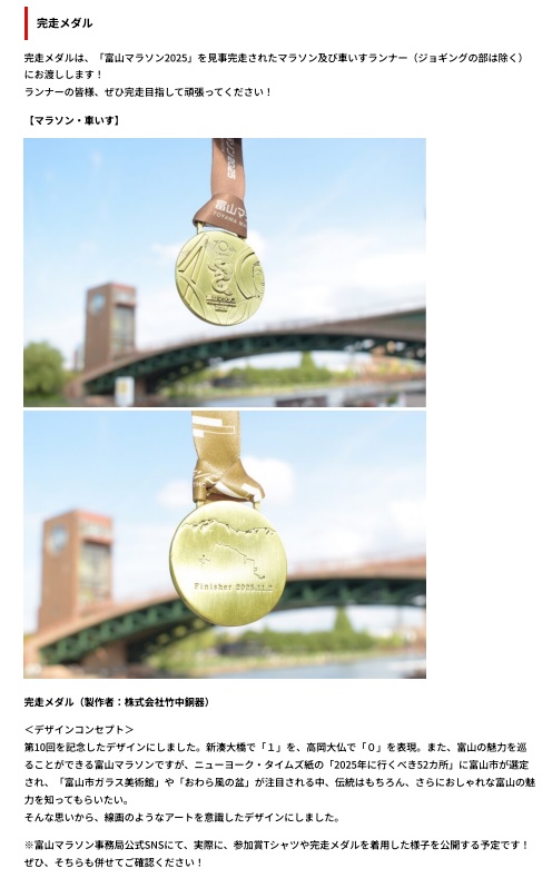 富山マラソン公式サイト  https://www.toyamamarathon.com/news/convention/t-shirtmedaru2025/